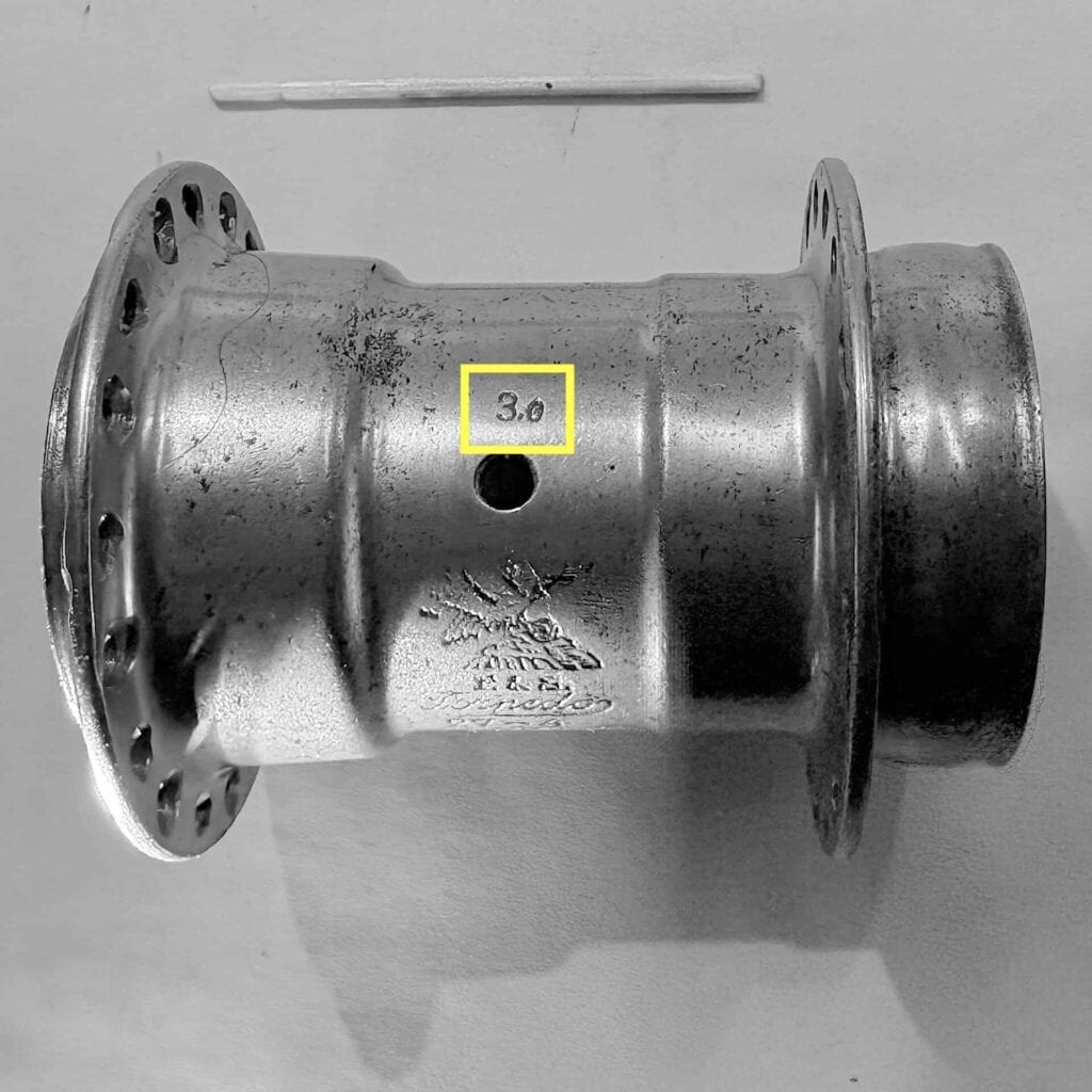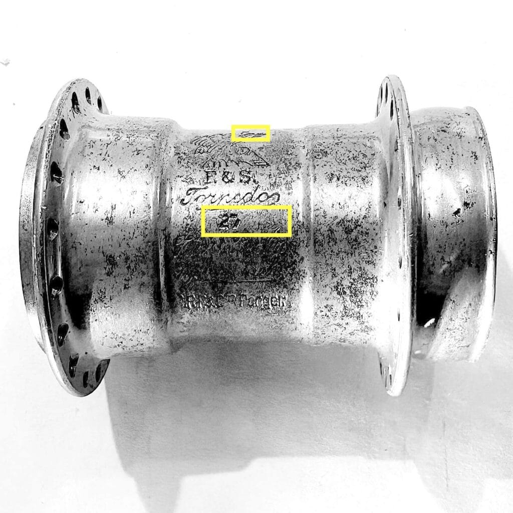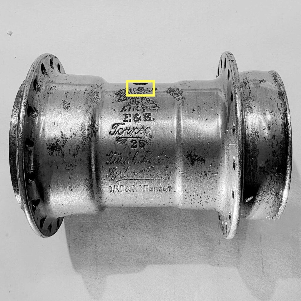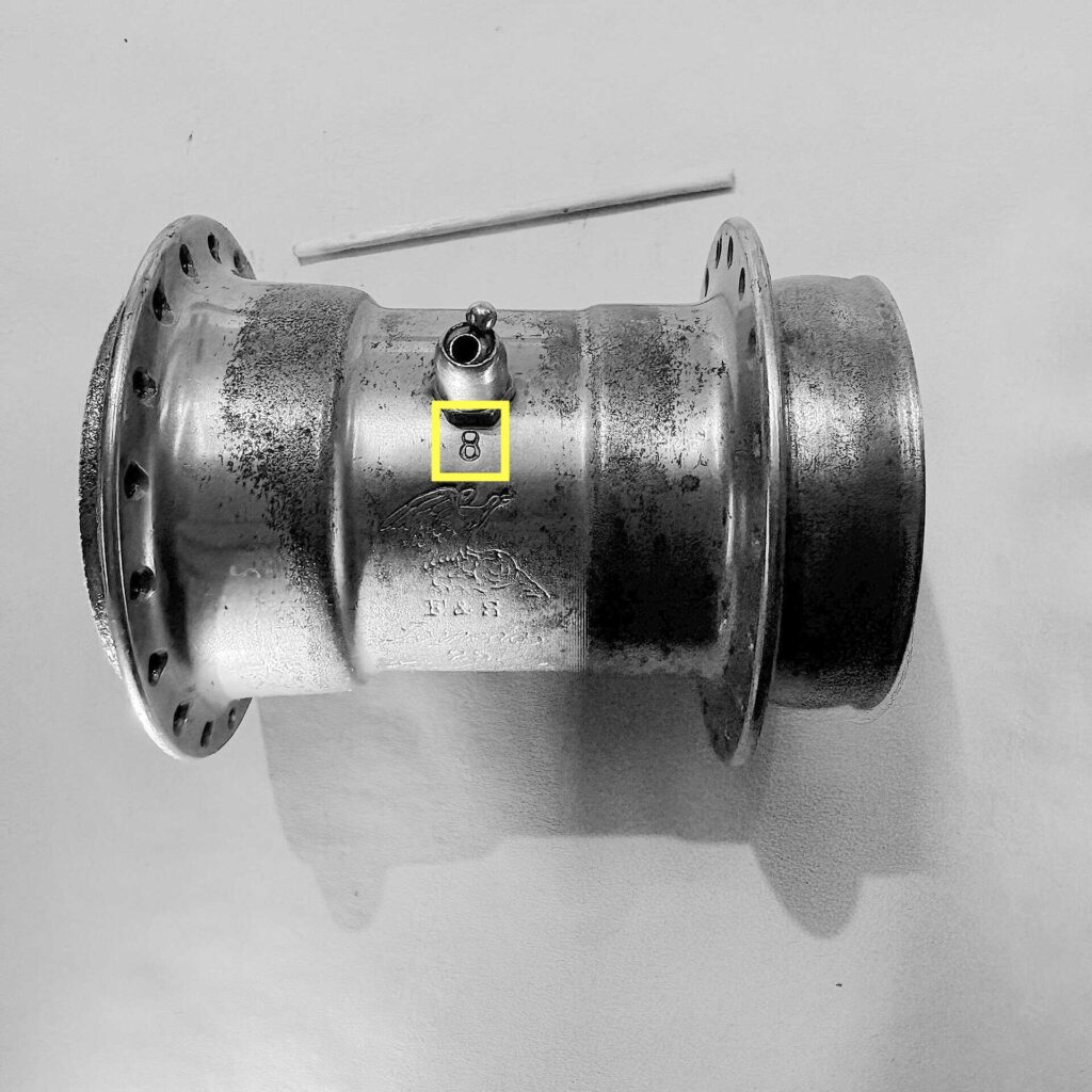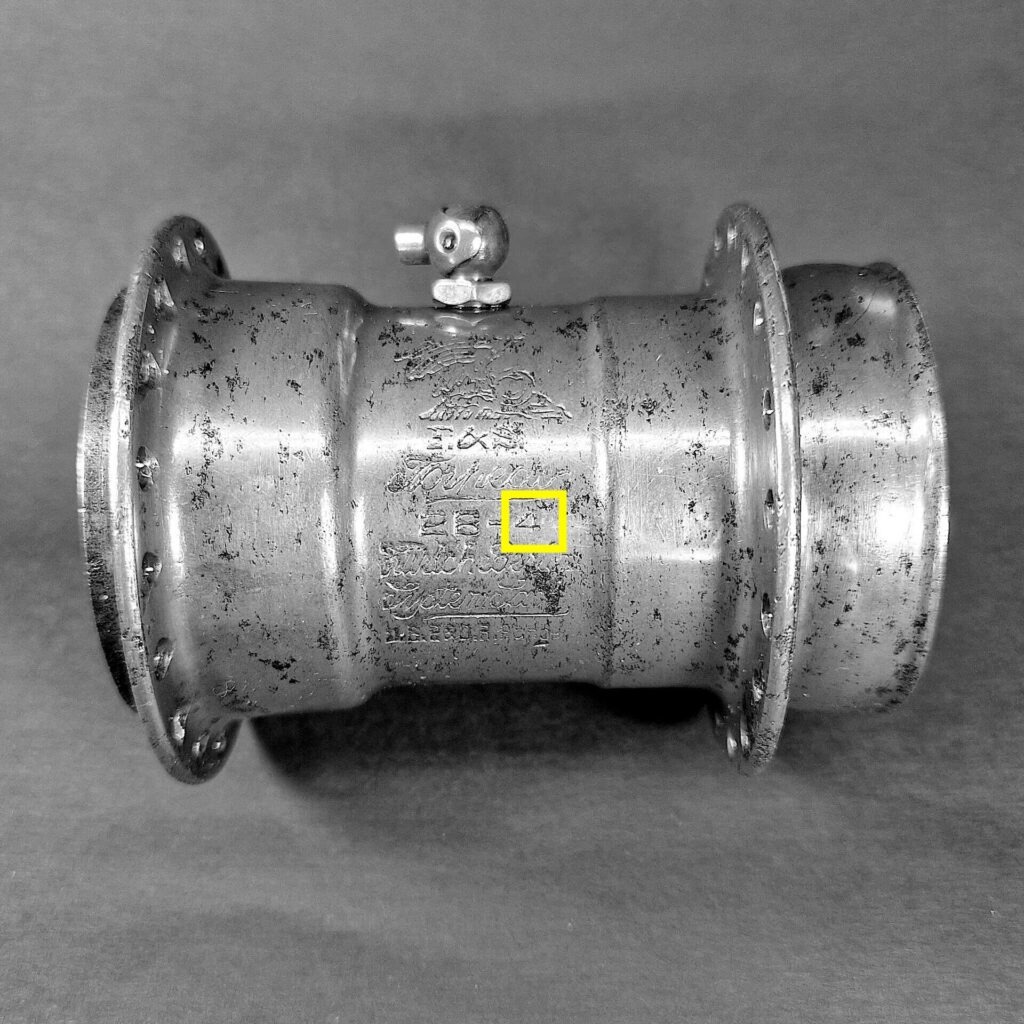 Ebenfalls unklar ist die Bedeutung der bei beiden Stempelungen verwendeten, die unterhalb des Ölers eingeschlagen wurden. Hingegen ist die an gleicher Stelle auch bei anderen Naben häufiger anzutreffende Zahl, z.B. „3“, nur die Angabe des Durchmessers der Speichenlochbohrung in mm.