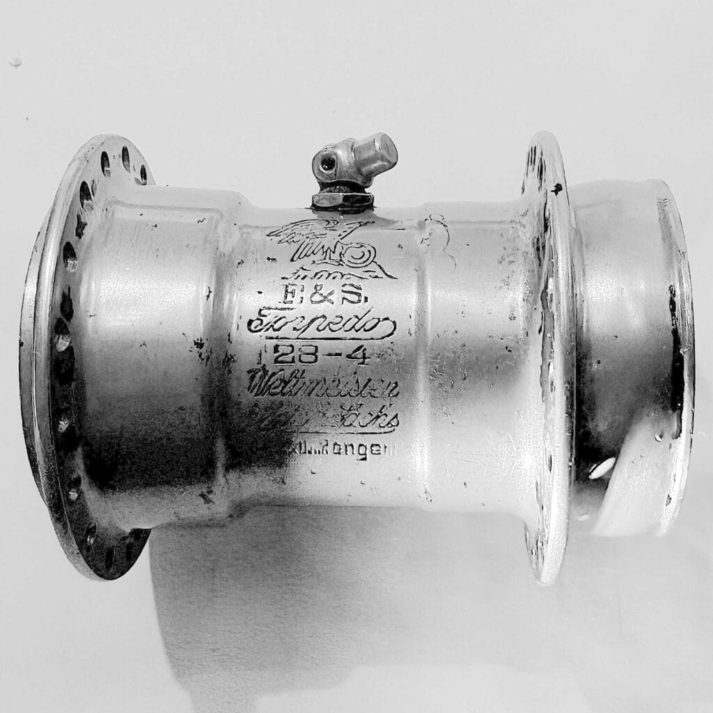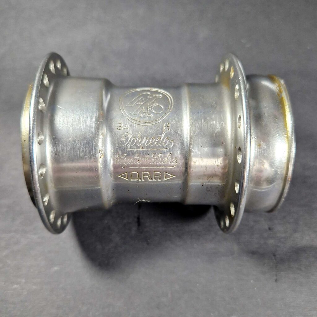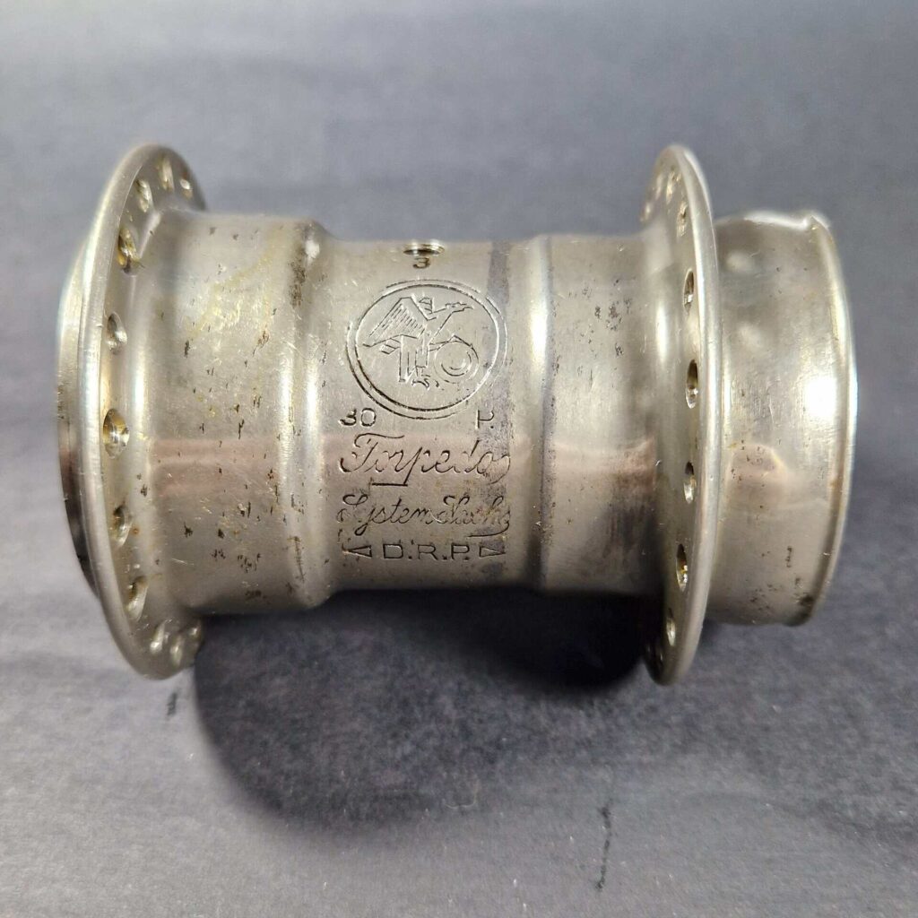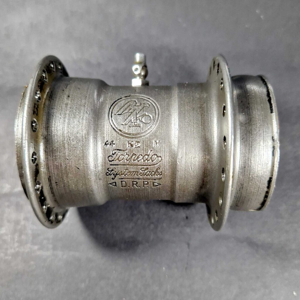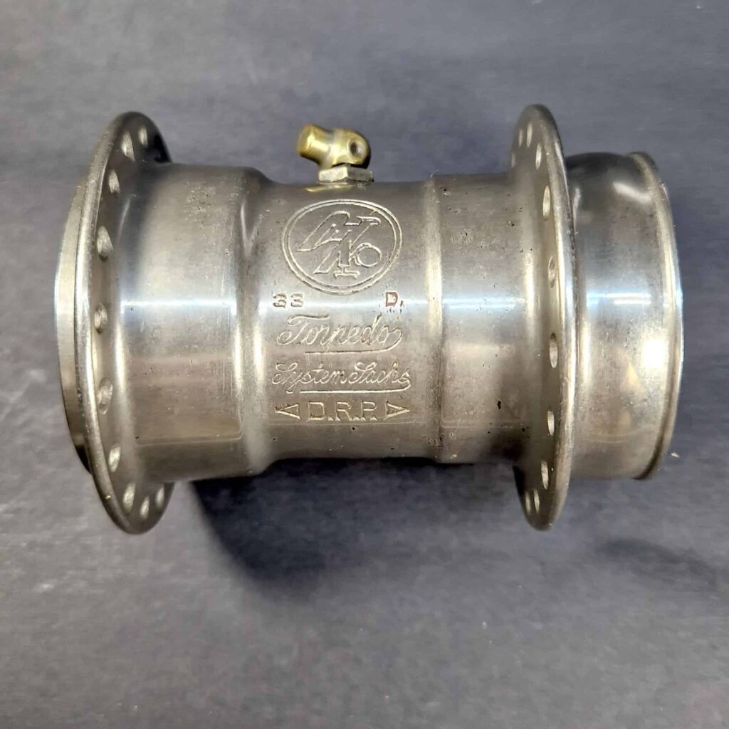 1930 erschienen dann jedenfalls Naben ohne Sonderstempelung. Im Gegensatz zur Weltmeisternabe gleichen Jahrgangs ist hier nur auf das „DRP“ hinzuweisen, das erstmals von zwei Dreiecken eingerahmt wird. Zudem wurde in den zugehörigen Bremshebel wiederum der gleiche rund eingerahmte Adler eingestanzt, der auch auf der Hülse zu sehen ist.