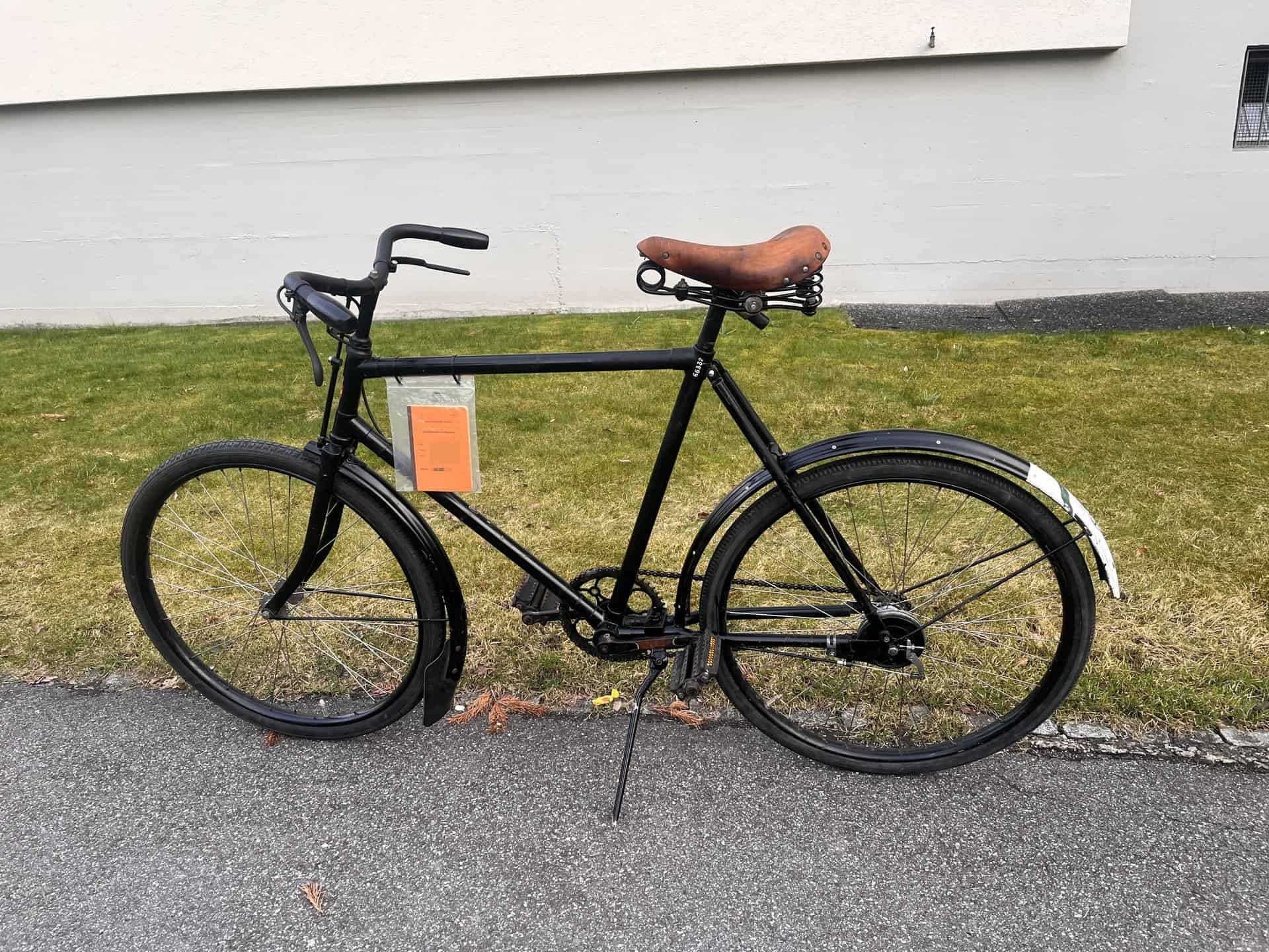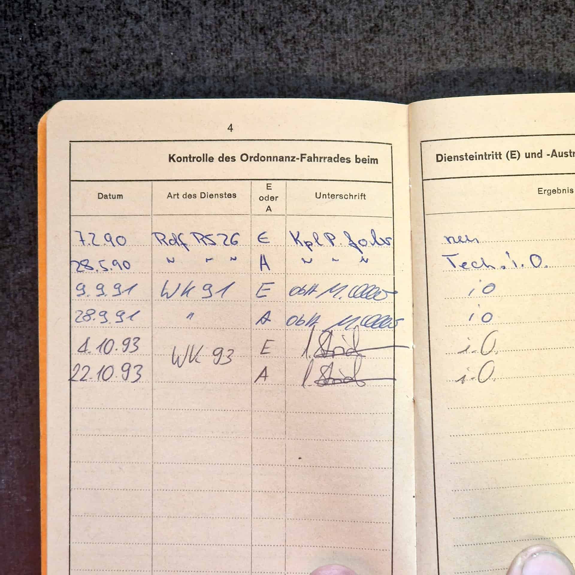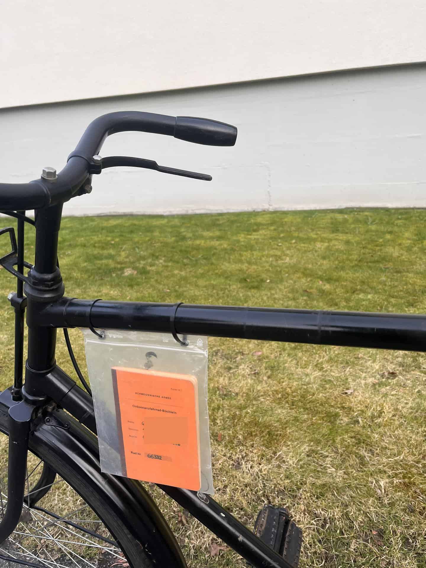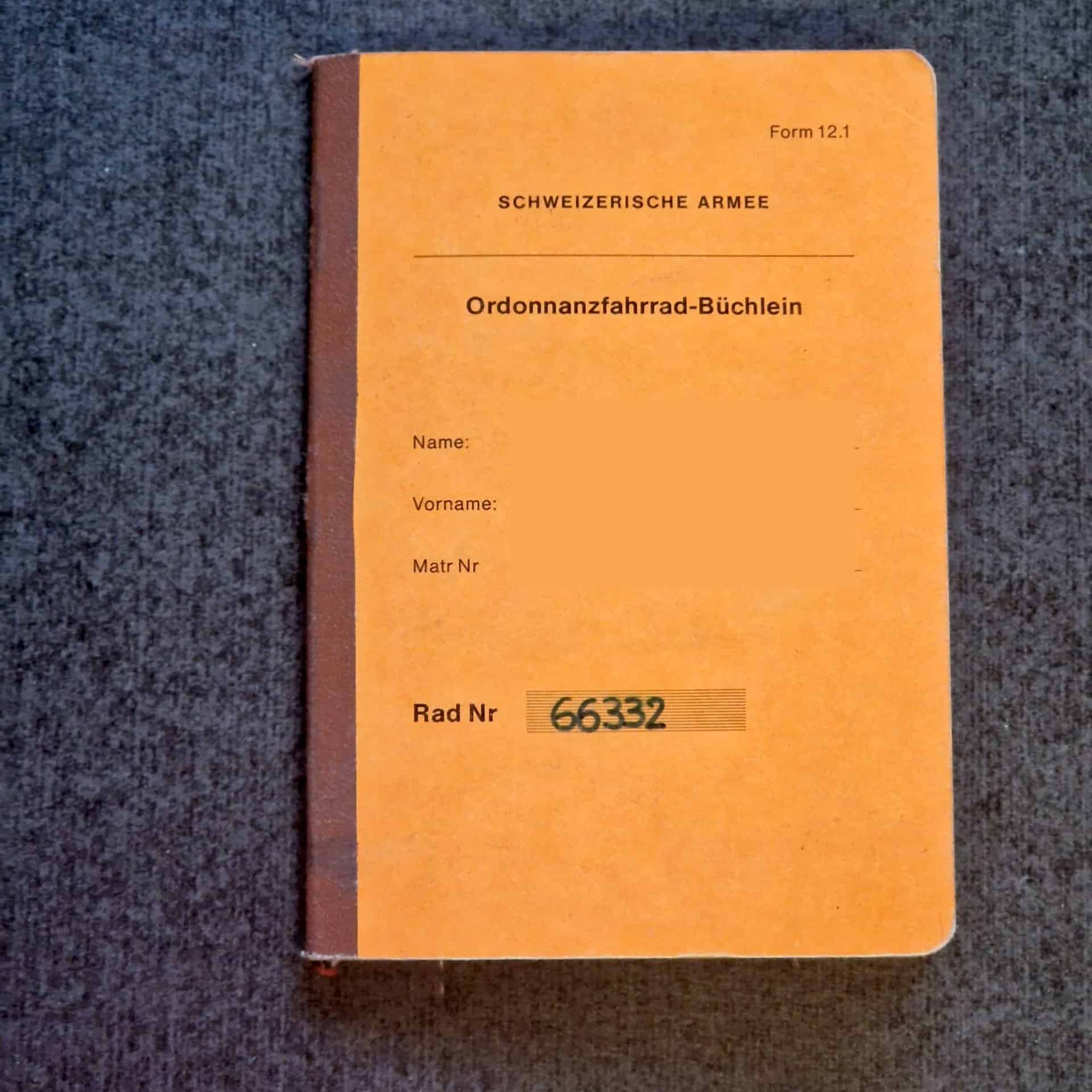 Ordonnanzrad 05 der Schweizer Armee, Seriennummer 66332, Jahrgang 1986. Mit Radbüchlein