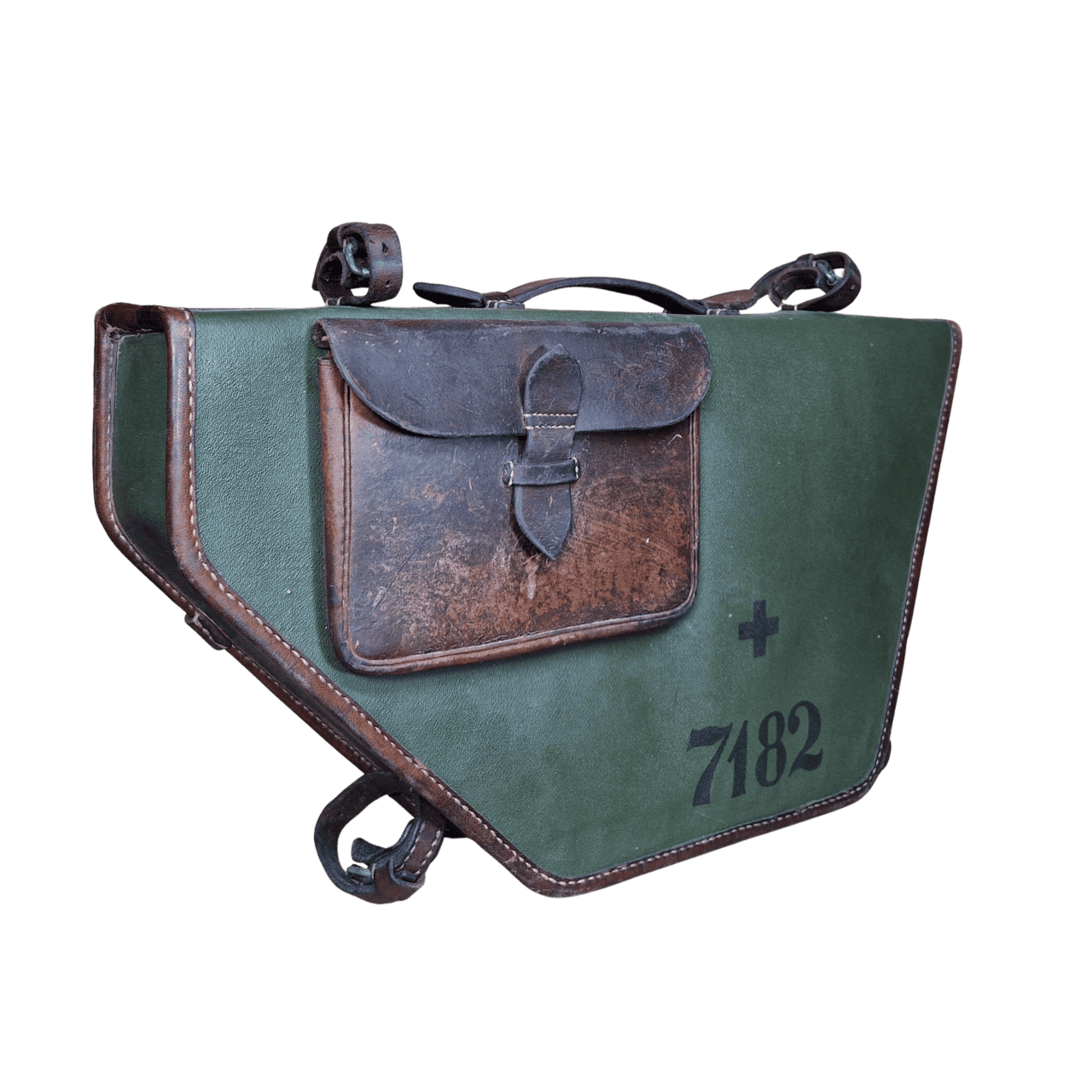 Schöne grüne Rahmentasche aus Rotlederkarton, spezieller Tornisterleinwand und Pegamoid. Ohne Defekte, alle Riemchen intakt. Hersteller: Sattlerei Schmutz, Jahrgang 1942, Seriennummer 7182.